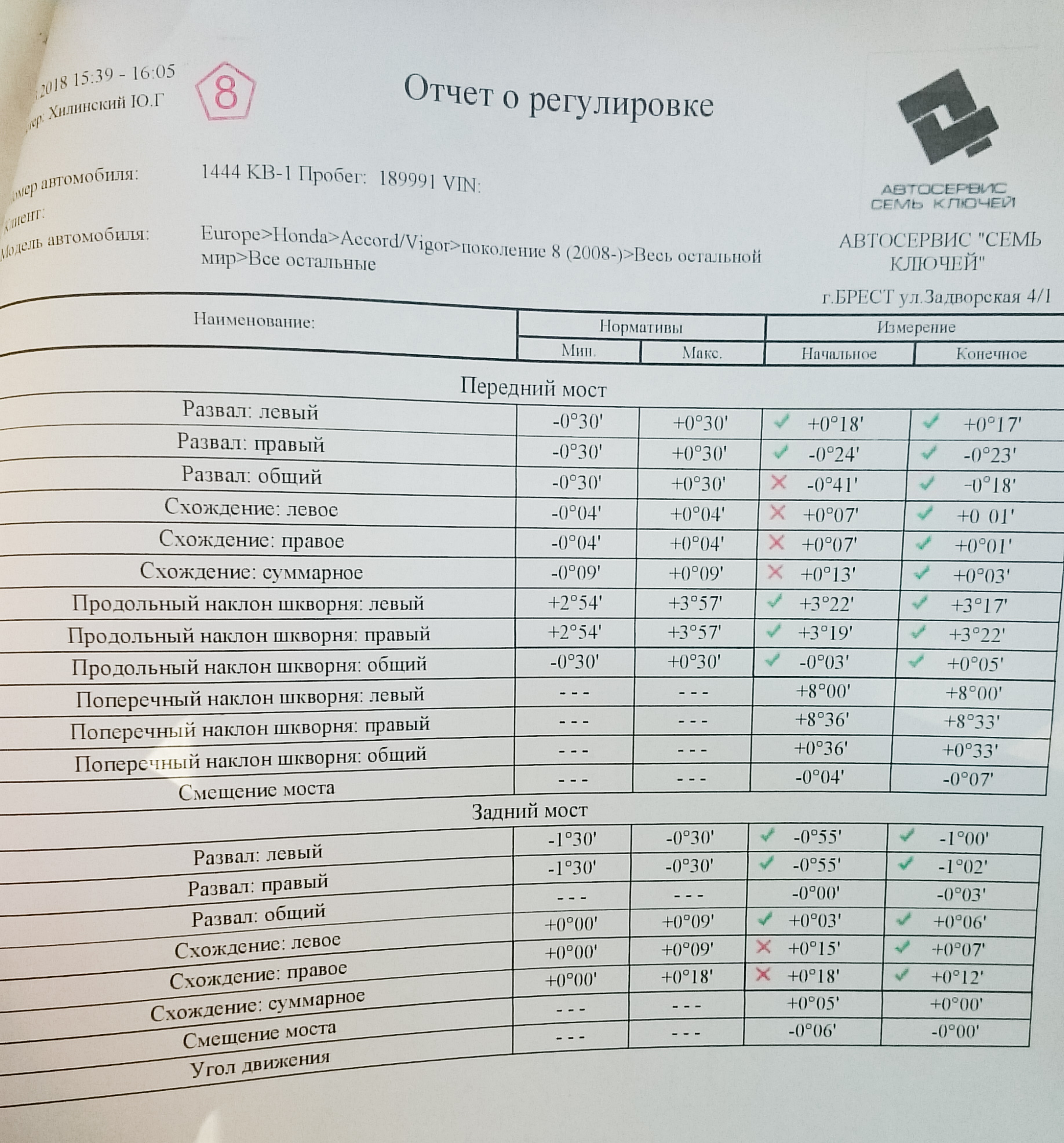 Following the suspension work, a wheel alignment was conducted to correct a slight drift to the right.