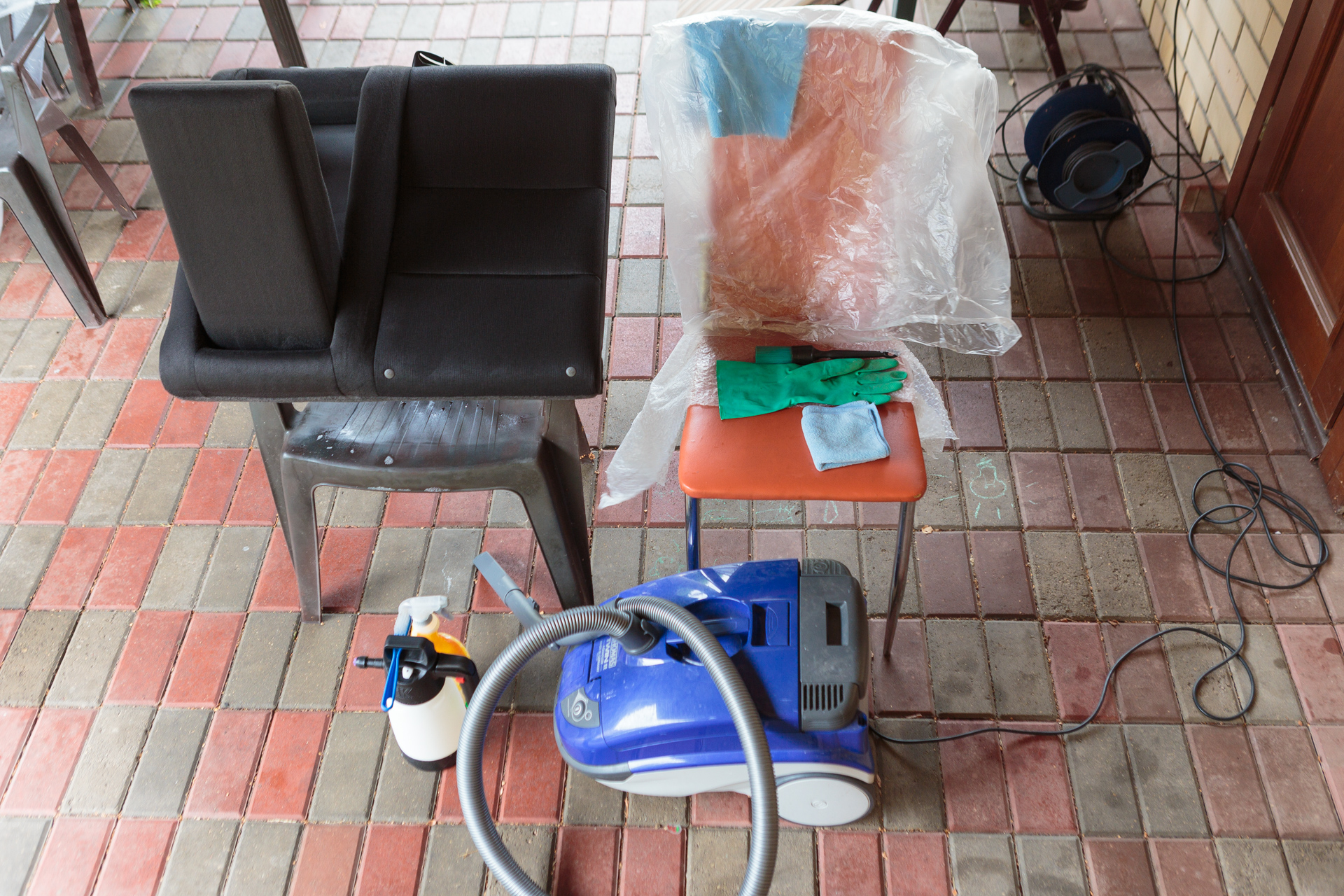 - Spray water and immediately vacuum on high power (1200 W), reducing the power if necessary